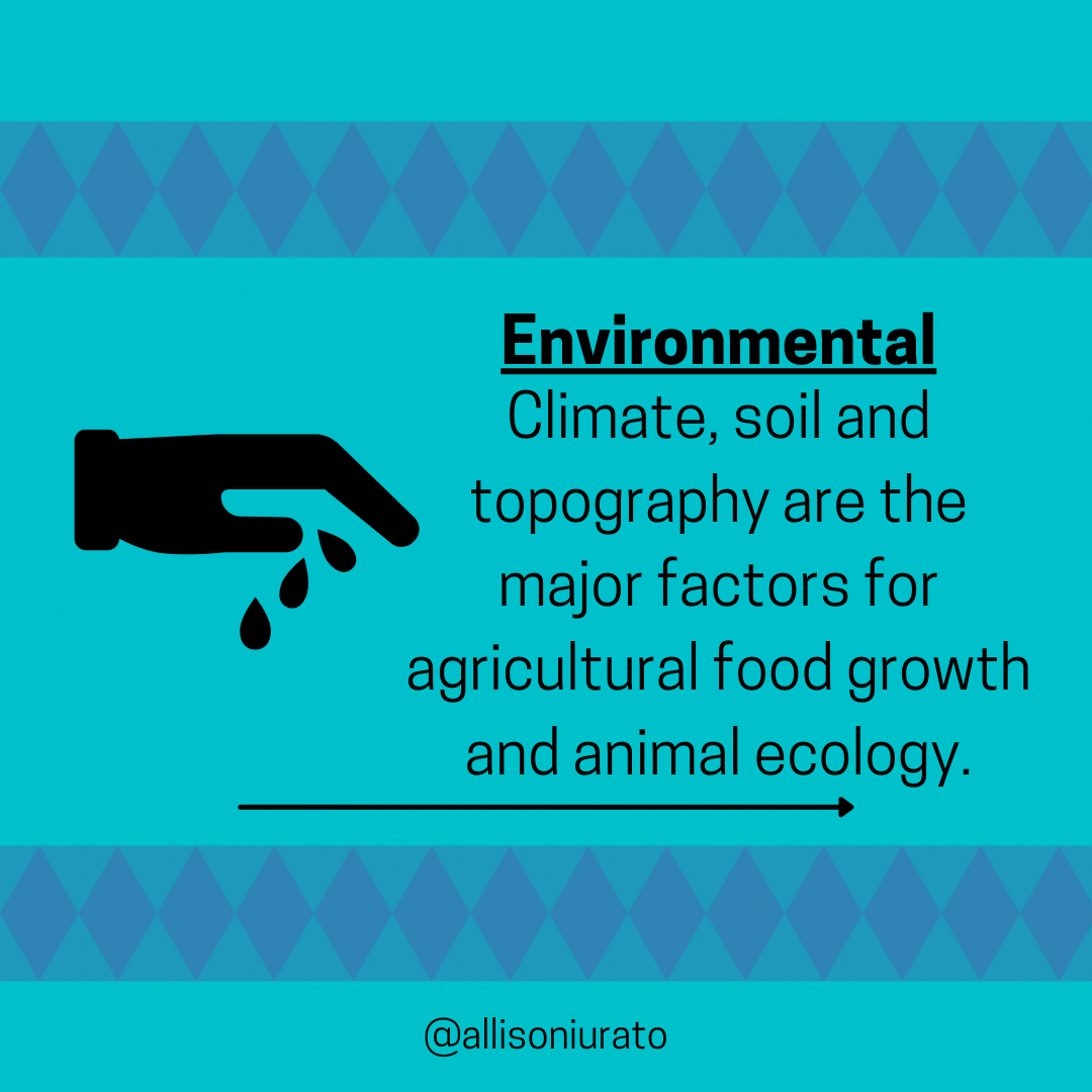 Environmental: Climate, soil and topography are the major factors for agricultural food growth.